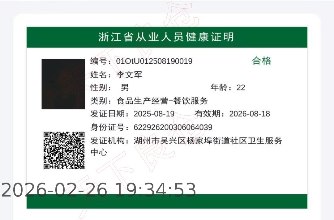 [健康证]高级中学钱江校区学生--李文军